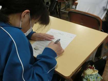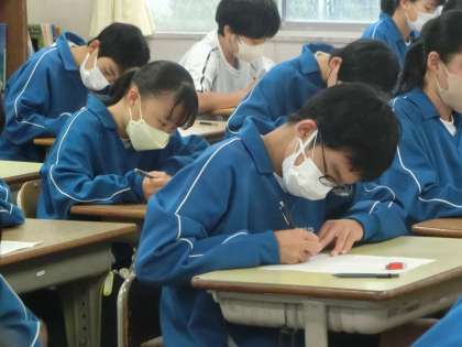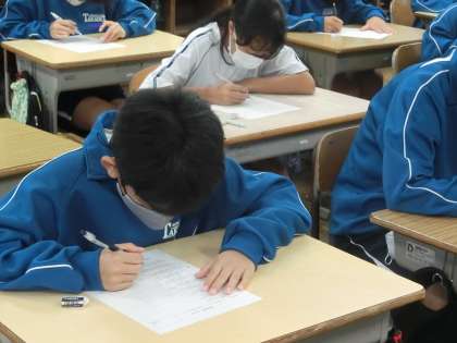 学習した内容の小テストが行われていました。問題数は少ないですが、学習したことを出し尽くそうと必死になっている様子が伝わってきます。行事の練習などで忙しい毎日を送っていますが、これが中学校の生活です。ぜひ乗り切ってほしいと思います。