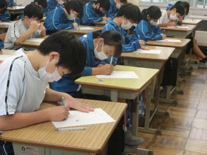 学習した内容の小テストが行われていました。問題数は少ないですが、学習したことを出し尽くそうと必死になっている様子が伝わってきます。行事の練習などで忙しい毎日を送っていますが、これが中学校の生活です。ぜひ乗り切ってほしいと思います。