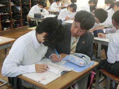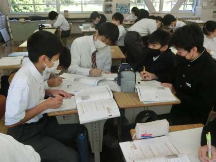 学習した単元の内容の総復習として、演習問題に取り組んでいました。正解に導くことはもちろん、正解に至るまでの解き方や計算間違いしないためのコツなどを仲間と共有していました。理解が十分でないところも気軽に仲間に聞けて、充実した時間になったようです。