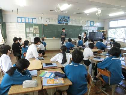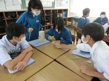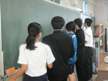 ALTとのコミュニケーションの授業でした。読まれる英文を聞き取ったり、日本語を英文に訳したりすることを、グループ対抗戦のゲーム感覚で行っていきます。ポイントを獲得しようとグループで楽しそうに活動している様子が印象的でした。