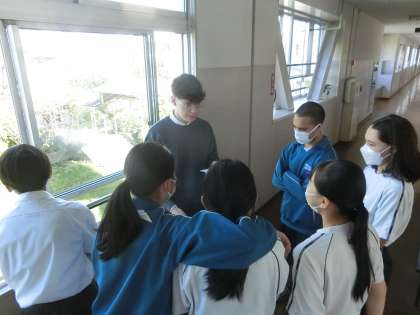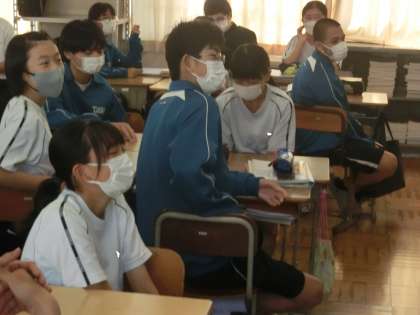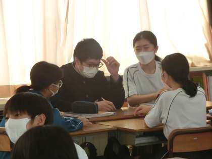 ALTとのコミュニケーションの授業でした。読まれる英文を聞き取ったり、日本語を英文に訳したりすることを、グループ対抗戦のゲーム感覚で行っていきます。ポイントを獲得しようとグループで楽しそうに活動している様子が印象的でした。