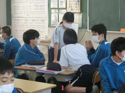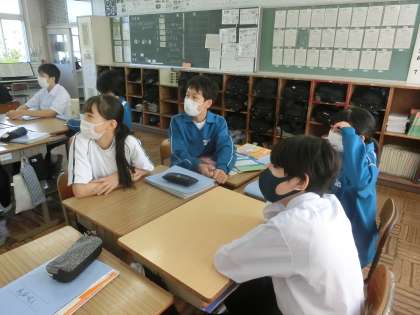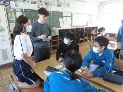 ALTとのコミュニケーションの授業でした。読まれる英文を聞き取ったり、日本語を英文に訳したりすることを、グループ対抗戦のゲーム感覚で行っていきます。ポイントを獲得しようとグループで楽しそうに活動している様子が印象的でした。