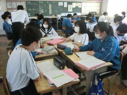 10/7 指折り数え、エールを届ける 3 公開日 2023/10/07 更新日 2023/10/07 各学年から 昨日の2年4組の国語の授業の様子です。 「短歌を味わう」の単元もいよいよ終盤に入りました。今回は「未来の自分にエールを届けよう」をテーマに作品づくりに取り組んでいました。夢に突き進む自分を想像したり、困難にぶつかって悩んでいる自分を想像したりして、エールを考えています。普通の作文と違い、文字数に制限がある短歌。指で数えている姿を多く見かけました。
