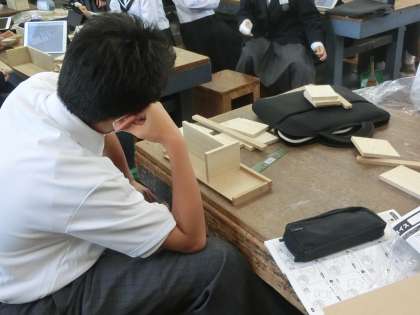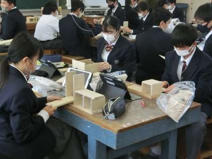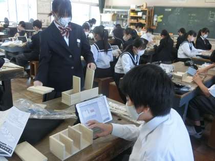 立体設計図が作成できるアプリを使ったり、実際に木材を組み合わせたりして、自分が作りたい木製品のイメージを出し合っていました。いろいろなアイデアを出し合いながら、出来上がりを楽しみにしている生徒がたくさんいることが伝わってきました。