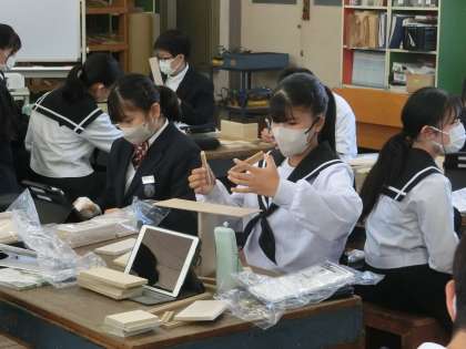 立体設計図が作成できるアプリを使ったり、実際に木材を組み合わせたりして、自分が作りたい木製品のイメージを出し合っていました。いろいろなアイデアを出し合いながら、出来上がりを楽しみにしている生徒がたくさんいることが伝わってきました。