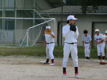 写真は、野球部の様子です。盗塁の練習中でした。攻撃側と守備側に分かれ、本気で勝負していました。互いにかけ合う声もしっかり出ており、真剣ながらも笑顔の多い練習の様子に感心しました。