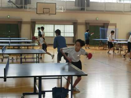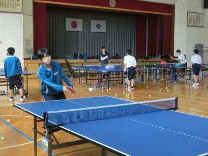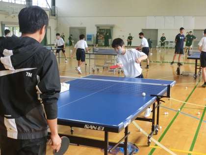 写真は、卓球部の様子です。地域指導者の熱心な指導のもと、選手たちも真剣に練習に向かっています。