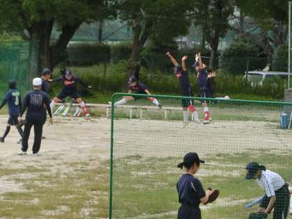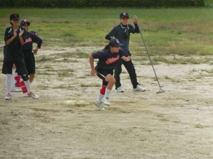 写真は、ソフトボール部の様子です。前回大会での好成績とたくさんの熱心な指導者に囲まれ、練習にも活気が出ています。どのメニューも楽しんで取り組んでいる様子から、その雰囲気が伝わってきます。