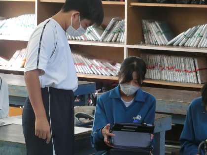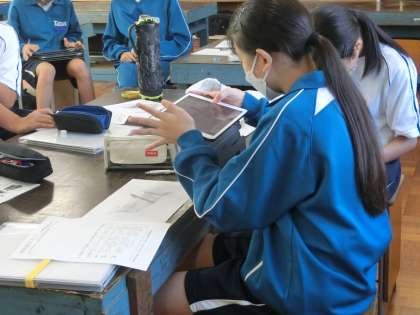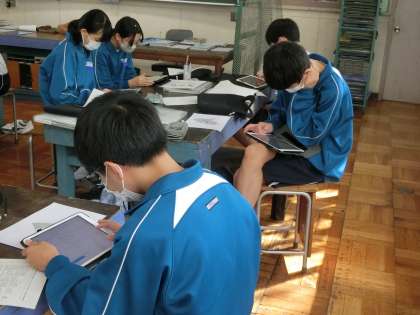 筆箱と筆記用具を題材にしたデッサンでの作品が完成し、鑑賞会が行われていました。自分の作品をタブレットで撮影し、送られてきたデータを見ながら感想を述べていきます。仲間の作品から勉強になったこともたくさんありそうです。