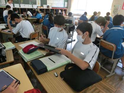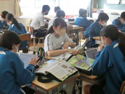 「中部地方をPRしよう!」をテーマに学習が進められていました。農業、工業、観光業、伝統産業、地場産業など、興味ある分野でグループを作り、仲間とアイデアを出し合いながらPR紙を作成していきます。学習した内容からどんなものに発展していくか、期待が膨らみます。