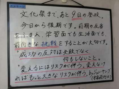 10/10 後期のスタートにあたって… 公開日 2023/10/10 更新日 2023/10/10 各学年から 後期のスタートにあたって、ホワイトボードのメッセージが新しくなっていました。「前向きに挑戦すること」が記されています。 また、有名人の名言も書かれていました。 「成功の反対は失敗ではなく、何もしないこと」 「変えるにはリスクが伴う。 変えなければ、もっと大きなリスクが伴う」