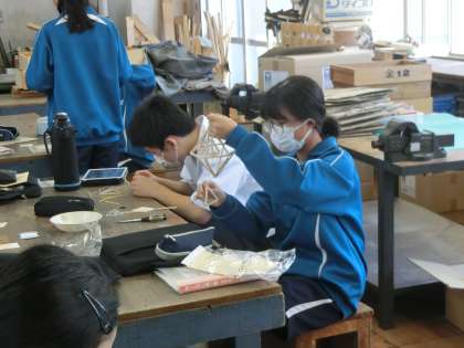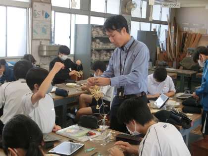 10/10 いかにイメージに近づけるか 4 公開日 2023/10/10 更新日 2023/10/10 各学年から 2年1組の技術科の授業の様子です。 「ヒンメリ」をイメージしたLED照明の制作です。ストローと糸だけで立体的な形を作っていきます。立体設計図を描けるタブレットのアプリを使って、しっかりと完成品のイメージができています。仲間の助けも借りながら、根気よく組み立て作業を続けています。
