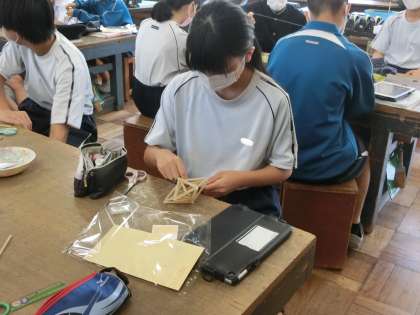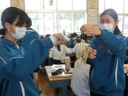 10/10 いかにイメージに近づけるか 5 公開日 2023/10/10 更新日 2023/10/10 各学年から 2年1組の技術科の授業の様子です。 「ヒンメリ」をイメージしたLED照明の制作です。ストローと糸だけで立体的な形を作っていきます。立体設計図を描けるタブレットのアプリを使って、しっかりと完成品のイメージができています。仲間の助けも借りながら、根気よく組み立て作業を続けています。