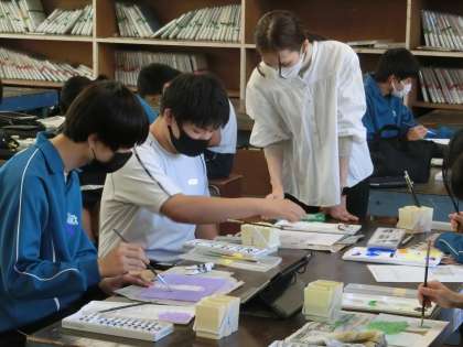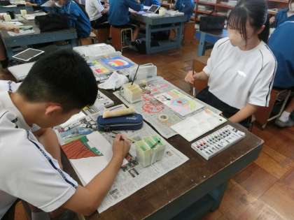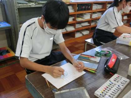 オリジナルの空想画もいよいよ最終工程の色付け作業。ものすごい集中力で取り組んでいる様子が伝わってきます。アイデアのたくさん詰まった作品が出来上がりそうです。
