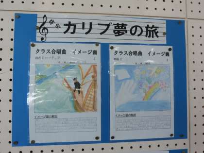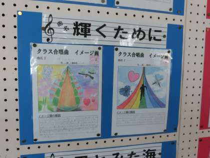 2週間後に迫った合唱コンクールに向け、各クラスで作成してきた「曲のイメージ画」が完成し、音楽室に掲示されました。