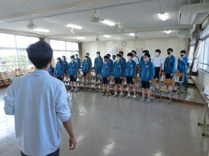 合唱コンの練習を全体で行っていました。練習の様子を見に来た学級担任が、日頃の練習の成果が出るよう、生徒たちに声をかけています。この1時間で成長につながる何かを得ようと、生徒も先生も必死です。