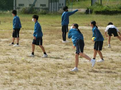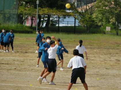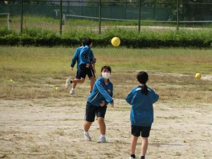 体育館でのバレーボールの授業を終え、運動場でのハンドボールの学習に入っていました。今度は「投げる」「キャッチする」などの動作が中心になるものです。久しぶりの運動場での授業に天気も味方して、生徒たちも元気に活動していました。