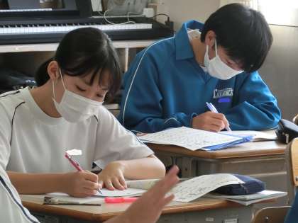 一次関数の利用について学習していました。文章問題から式を立て、小問題ごとに答えていきます。こうした問題のパターンは、最終的な答えを導き出すヒントになっていることが多く、最初の問題でつまずいてしまうと、最後の問題の答えが出ない場合が多くあります。問題の解き方をしっかりと身につけてほしいと思います。