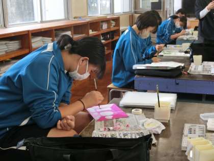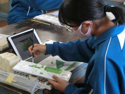 理想の空間の作品づくりで、最終工程の色付け作業です。タブレット内で考えた配色(イメージ画)に従い、マスキングテープを使ったりして丁寧に塗っていきます。無心になって取り組む時間です。