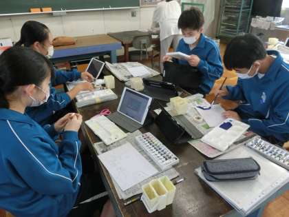 10/13 最終工程も丁寧に… 2 公開日 2023/10/13 更新日 2023/10/13 各学年から 2年5組の美術の授業の様子です。 理想の空間の作品づくりで、最終工程の色付け作業です。タブレット内で考えた配色(イメージ画)に従い、マスキングテープを使ったりして丁寧に塗っていきます。無心になって取り組む時間です。
