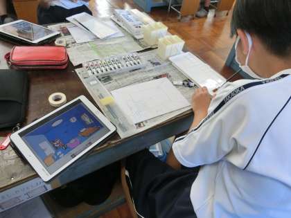 10/13 最終工程も丁寧に… 3 公開日 2023/10/13 更新日 2023/10/13 各学年から 2年5組の美術の授業の様子です。 理想の空間の作品づくりで、最終工程の色付け作業です。タブレット内で考えた配色(イメージ画)に従い、マスキングテープを使ったりして丁寧に塗っていきます。無心になって取り組む時間です。