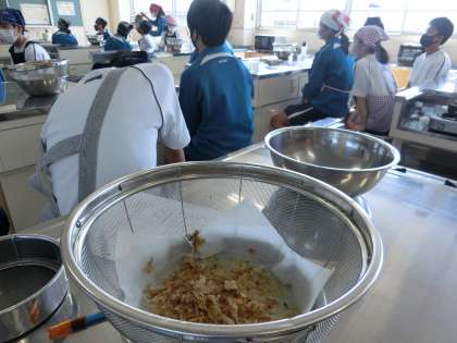 「日本が誇るUМAМI(うま味)の良さとは?」というジャンプ課題への挑戦で、鰹節から出汁とふりかけづくりの調理実習が行われていました。ふりかけをつくるため、出汁を取った鰹節を冷ましている間に、うま味についてしっかりと学習していました。