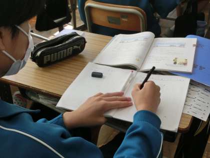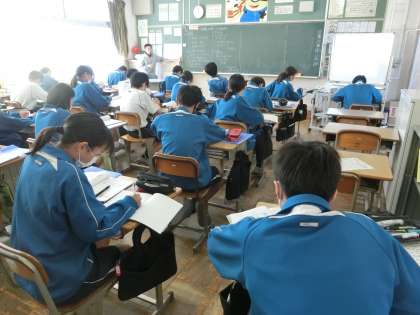 「一次関数の利用」の学習で、「グラフから読み取る」というタイプの問題に取り組んでいました。縦軸と横軸はそれぞれ何を表しているのか、傾きの角度は何を意味しているのかなど、グラフだけから読み取れることをしっかりと学んでいました。
