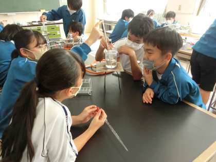 「再結晶にチャレンジしよう!」をテーマに実験が行われていました。硝酸カリウムと食塩の水溶液から再結晶を作っていきます。実験中、変化していく水溶液の様子に興味がさらにわいてきたようです。