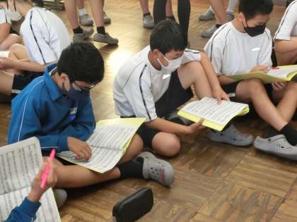 10/16 何とかしなきゃ! 3 公開日 2023/10/16 更新日 2023/10/16 各学年から 2年2組の合唱タイムの様子です。 パートごとに集まり、クラス合唱のレベルアップに向けて緊急会議です。今後の練習で意識すべき点を細かく確認しています。これからの練習でも常に目にする楽譜に、改めてポイントを書き込んでいました。