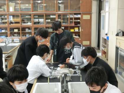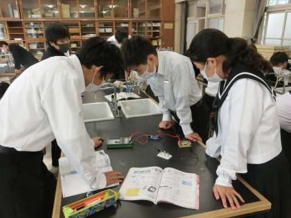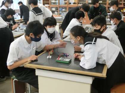 「電流とその利用」の単元で、「電流計の使い方をマスターしよう」というテーマで学習が進められていました。電流計のつなぎ方やつなぐ順番などを学んだあと、実際に電流計に触れ、操作を体得していました。