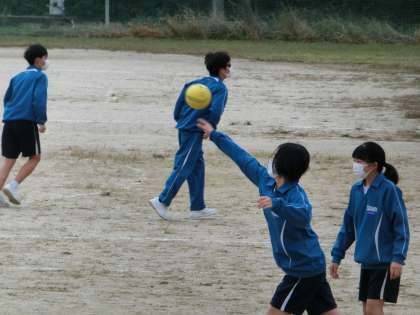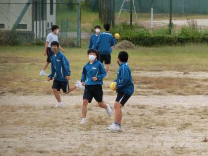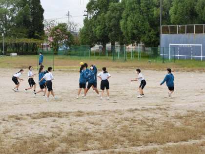 運動場でハンドボールの学習です。まずは試しのゲームを行い、身につけたい技能やルール、戦術などを考えていきます。単元が終わるころ、仲間と協力して点を取ることを身につけてほしいと思います。とにかくよく声が出ていました。