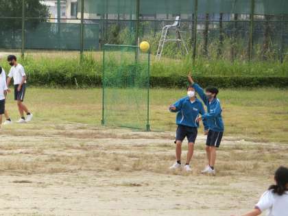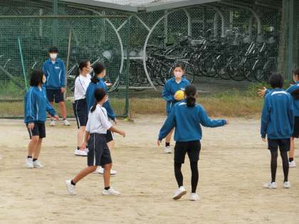 運動場でハンドボールの学習です。まずは試しのゲームを行い、身につけたい技能やルール、戦術などを考えていきます。単元が終わるころ、仲間と協力して点を取ることを身につけてほしいと思います。とにかくよく声が出ていました。