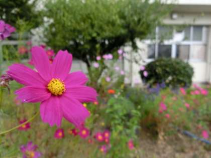 職員室前の花壇は夏の花が役目を終え、春用の花壇に変わろうとしています。ただ、秋の雰囲気を感じるため、コスモスだけは残されています。少し寂しい感じもしますが、再び満開になったときの春の花壇を楽しみにしたいと思います。