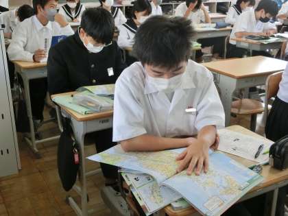 写真は2年4組の社会・地理分野です。「東北地方について知ろう」をテーマに学習に取り組んでいました。
