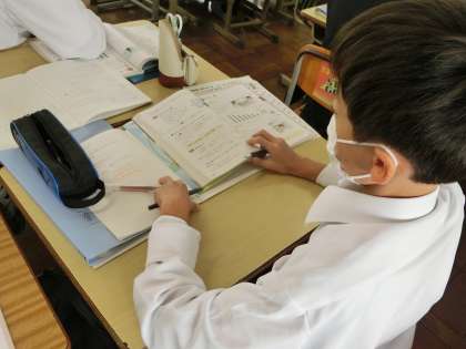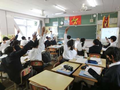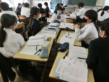 写真は1年3組の数学です。「比例の式」について学んでいました。