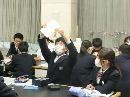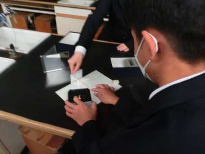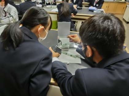 写真は1年5組の理科です。「光の反射」に関する学習で「入射光と反射光にはどのような関係がある?」をテーマに実験が行われていました。