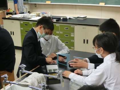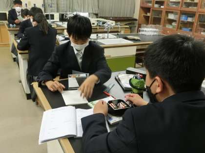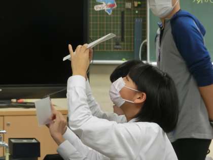 写真は1年5組の理科です。「光の反射」に関する学習で「入射光と反射光にはどのような関係がある?」をテーマに実験が行われていました。