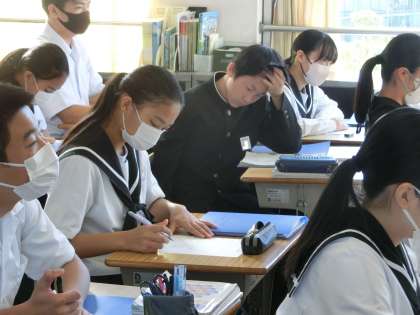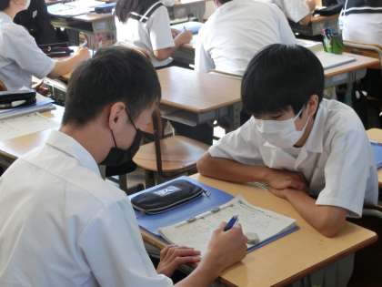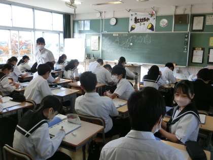 写真は3年4組の数学です。「相似」の学習で「角の二等分線」が条件の場合の問題を解いていました。