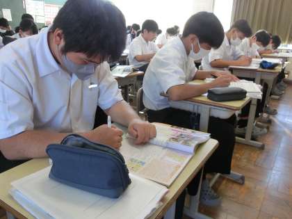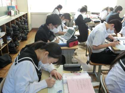 写真は3年2組の社会・公民分野です。「地方自治」の学習のまとめとして、「中学生が自分たちの住む町のためにできることは何か?」をテーマに、単元の学習を通しての自分の考えをまとめていました。