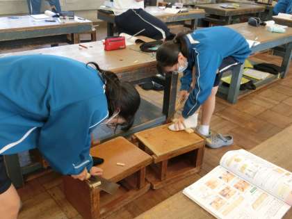 写真は1年2組の技術です。本格的な木製品づくりを前にのこぎりの使い方の技能を磨いていました。
