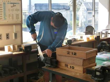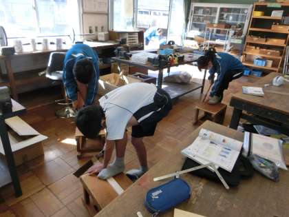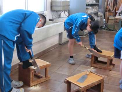 写真は1年2組の技術です。本格的な木製品づくりを前にのこぎりの使い方の技能を磨いていました。