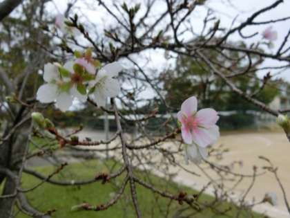 運動場に面した植え込みに植わる桜の木。よく見ると花が咲いていました。「スーパー残暑」と報道されるほど、11月に入っても気温が高かったためでしょう。桜自身は「だまされた!」と思っているのか、「ちょっと人間を驚かせてみようか」と思っているかは分かりませんが…。