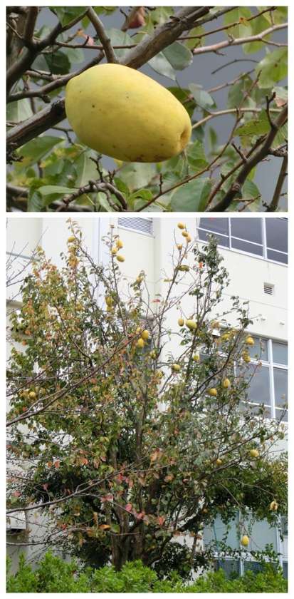 3棟前に植わるカリンの木には、拳の大きさをはるかに超える実がたくさんなっています。美しいピンク色の花を咲かせ、梨に似た実を付けることから、「カリン(=花梨)」と言われるそうです。また、たくさんの花を咲かせる様子から、「豊麗」や「優雅」といった花言葉もあるそうです。また、「(金を)借りん」という語呂合わせから商人にとって縁起木とされ、「商売繁盛」という花言葉もあるそうです。