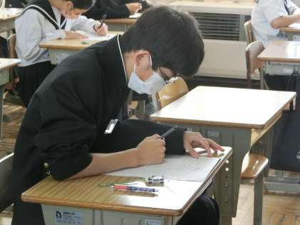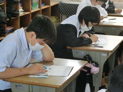 「一次関数」の単元のまとめのテストに取り組んでいました。目前に控えた定期テストの出題範囲にもなるところです。しっかりと理解して本番に臨んでほしいと思います。