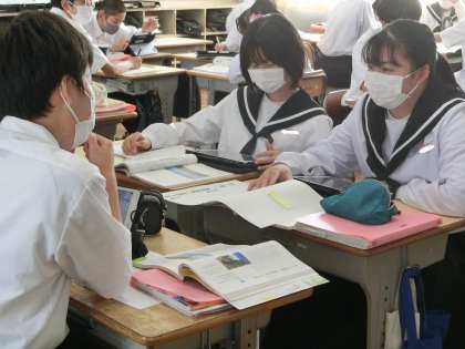 「モアイは語る」の単元で、「情報を集めて問いの答えを考えよう」をテーマに学習が進められていました。個人でしっかりと読み込みをしたあと、グループで問いの答えを導き出すための情報を発表し合っていきます。仲間の知恵を借りながら、問いの答えを一つずつ導き出していました。