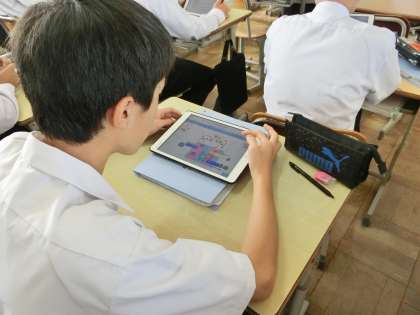 これまでに学習してきた「電池のしくみ」の理解を深めるために、各自が考えた電池のアイデアをプレゼンできるようにまとめていました。液体と金属の組み合わせや電極の配置など、いろいろとアイデアを出していきます。分かりやすく伝えようと、全員が必死に取り組んでいました。