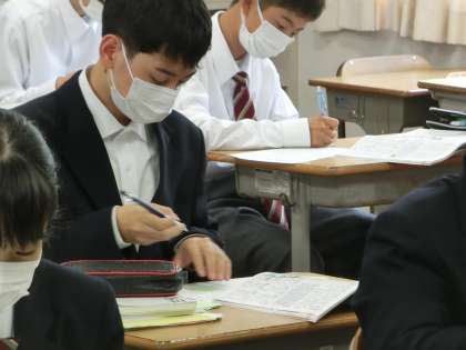 「故事成語」について学んでいました。学習用のプリントには、意味のみが書かれています。どんな故事成語を表しているのか、必死に探していきます。20問はなかなか大変な問題数でしたが、途中であきらめることなく、しっかりと学習に向かっていました。