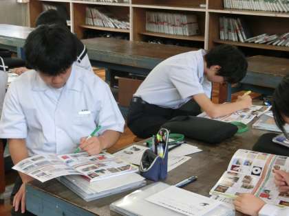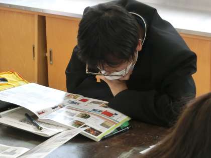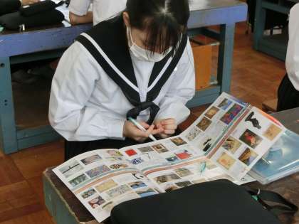 作品づくりを終え、資料を使っての美術史や各時代の美術作品の特徴について学んでいました。教科担任の解説を聞きながら、食い入るように資料集を見ている姿が印象的でした。