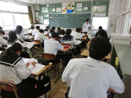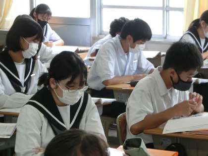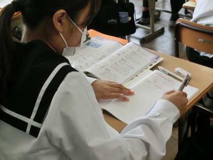 「電流とその利用」の単元で、「電流・電圧・抵抗の復習をしよう」をテーマに学習が進められていました。黒板を見るとたくさんの記号が書かれており、難度も格段に上がってきています。いよいよ定期テストも間近に迫ってきており、いつも以上の集中力で授業に臨んでいました。