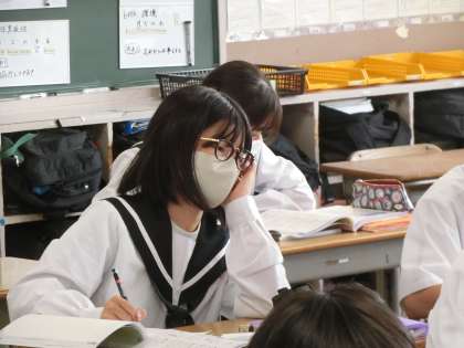 「電流とその利用」の単元で、「電流・電圧・抵抗の復習をしよう」をテーマに学習が進められていました。黒板を見るとたくさんの記号が書かれており、難度も格段に上がってきています。いよいよ定期テストも間近に迫ってきており、いつも以上の集中力で授業に臨んでいました。